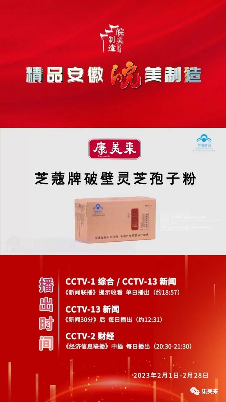 2月1日,康美來破壁靈芝孢子粉登陸央視CCTV1、CCTV新聞、CCTV2等黃金頻道播出廣告,這是繼2022年11月后時(shí)隔2個(gè)月再次在央視三個(gè)黃金頻道黃金時(shí)間推廣公司和產(chǎn)品,以“精品安徽”大品牌的形象廣告全國(guó)。